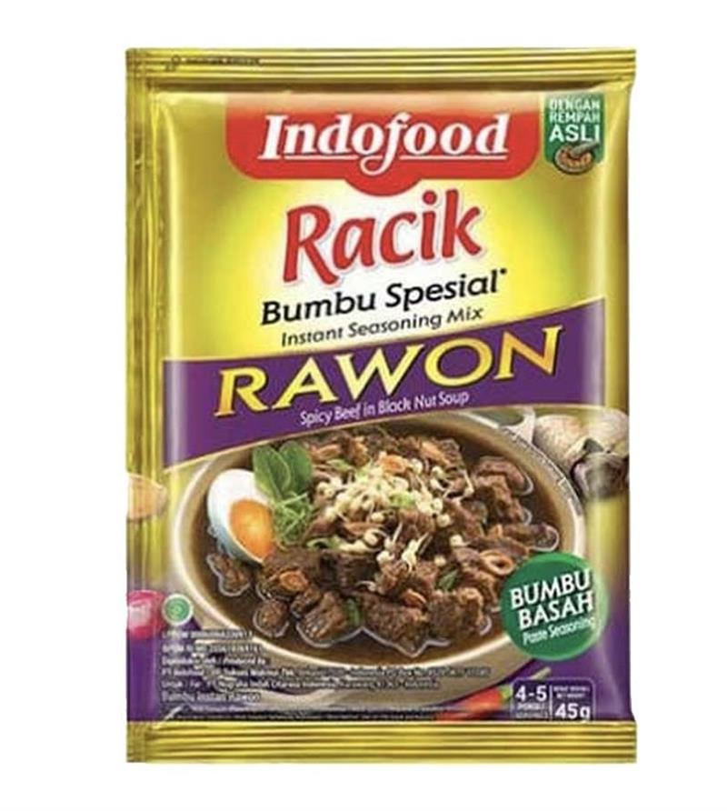 Indofood Spicy Beef Soup instant seasoning mix (Indofood Bumbu Rawon) in 1.6 oz in packet. Rawon soup is made of a mixture of garlic, shallot, keluak, ginger, candlenut, turmeric, red chili and salt sauteed with oil. Then the sauteed mixture is then poured into boiled beef stock with diced beef. Other seasonings that canbe added include: lemongrass, galangal, bay leaves, kaffir lime leaves and sugar. Good for 4-6 servings Product of Indonesia.
